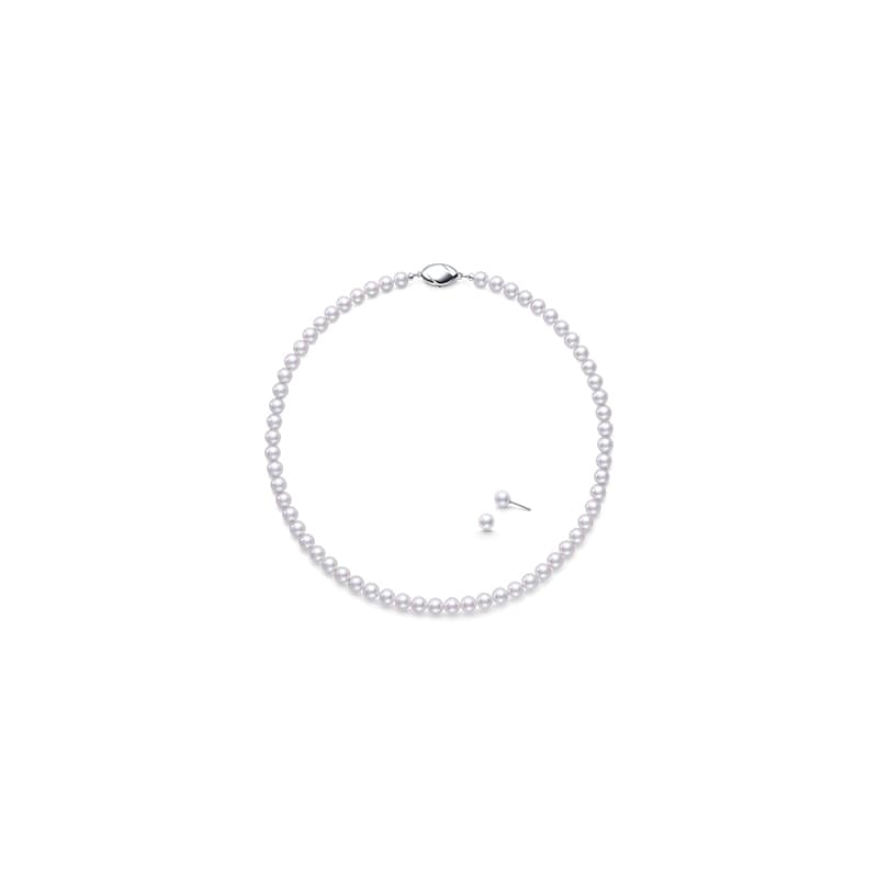 あらゆるシーンで活躍する、オーソドックスな一連パールネックレスとシンプルなピアスのセットです。華やかさはあっても派手にならないベストバランスを追求。珠の大きさ、色味が揃っているので、いざという時もコーディネートに悩みません。しなやかな装着感のワイヤーを採用し、糸換えなどのメンテナンスも不要。これからの人生を共に歩むパートナーとして、ずっとそばで見守り続けます。ピアスはイヤリングにも交換可能です。