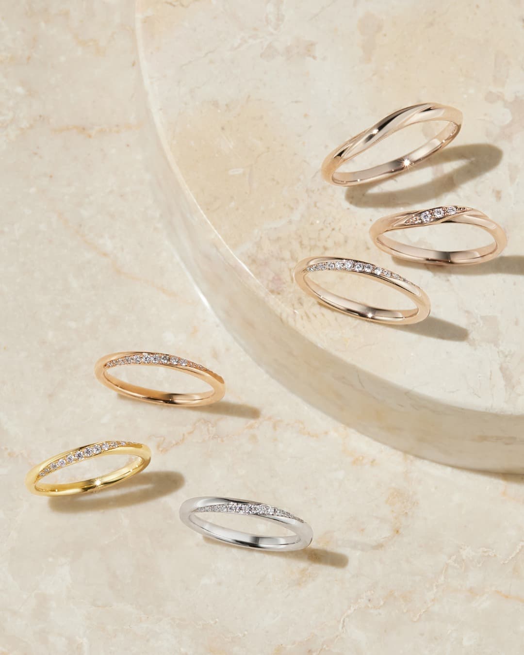 そんな結婚指輪の最大の特徴は、日常的に身に着けるという点。基本的には外すことがないので、普段の生活に支障をきたさないシンプルなデザインが好まれる傾向にあります。一方で、昨今は婚約指輪と一緒に身に着けられるデザインも増えていることから、2つの指輪の重ね着けを楽しむ方も増えています。