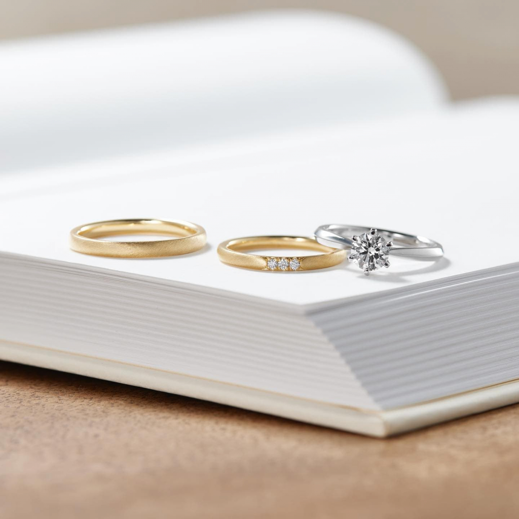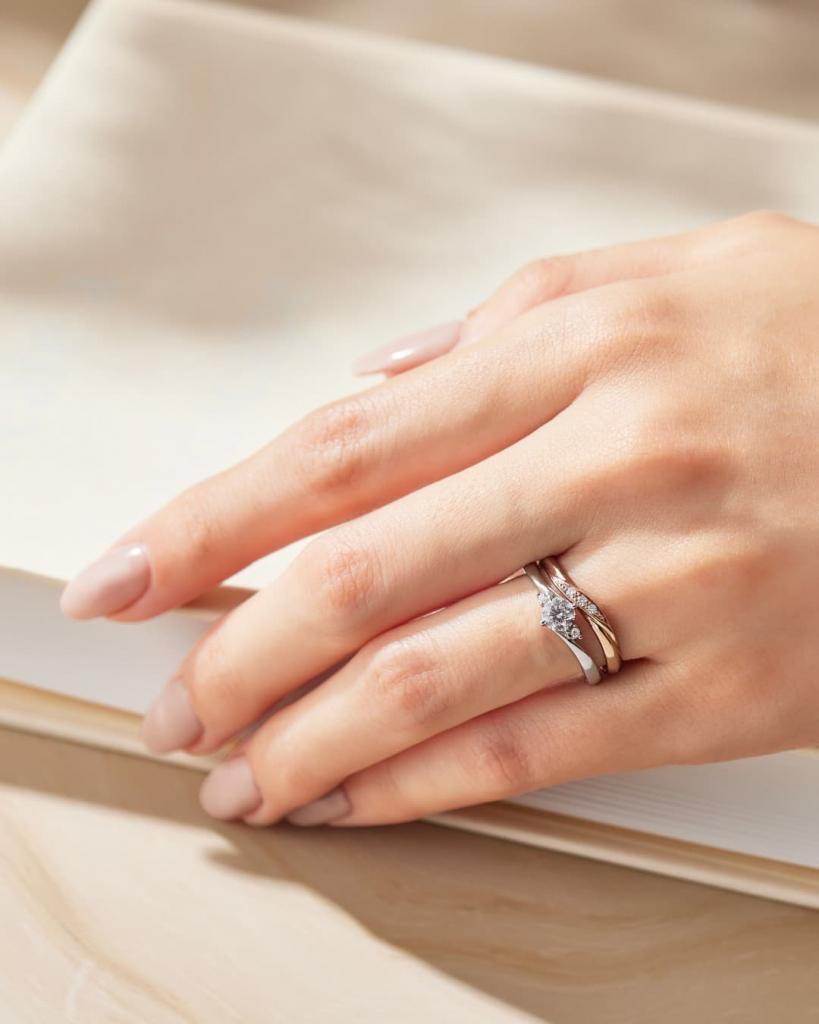 ゴールドの結婚指輪は、重ね着けのコーディネートを楽しめる点も魅力とされています。特に、婚約指輪をプラチナ、結婚指輪をゴールドなど、異素材を組み合わせることで、それぞれの素材が持つ輝きや質感が引き立ち、手元に奥行きのある印象を生み出します。異なる色味を重ねることでコントラストが生まれ、シンプルなデザインでも変化を感じられる点が特徴です。