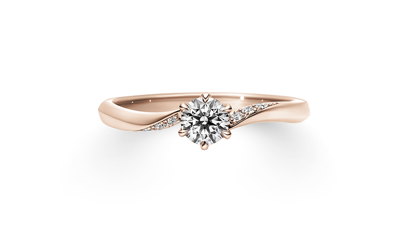 ブライダルブーケとして人気のフランネルフラワーをモチーフにした、清楚なエンゲージリング。8つの花々が流れるような美しい曲線を描きながら、中央のダイヤモンドを引き立てます。華やかでありながらも上品で繊細な印象を与える理由は、絶妙なアームのひねり。角度に沿って埋め込まれたメレダイヤモンドが、動くたびにキラキラと瞬き、所作までも美しく見せます。花言葉は「永遠の愛」。花束を贈るように、リングに想いを託して。