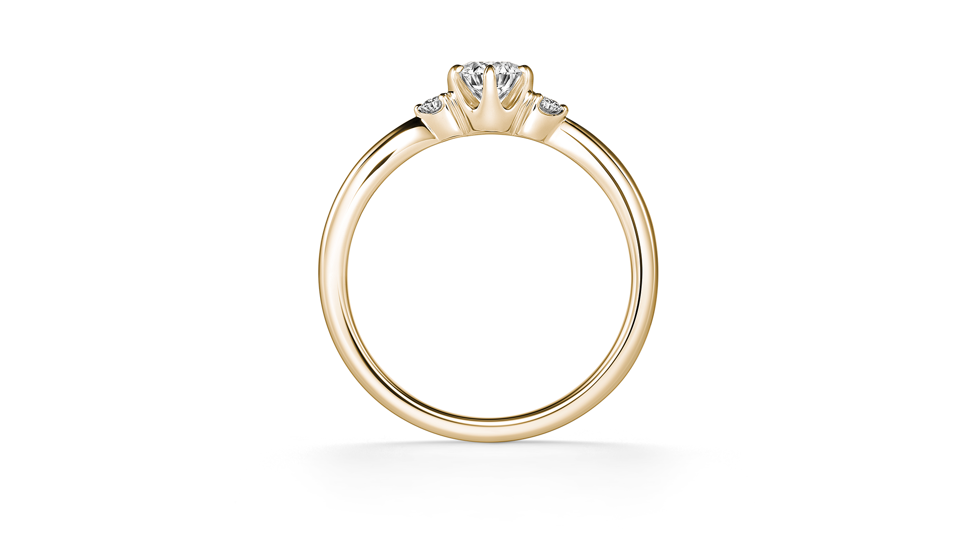 野山で見つけた、可憐なスミレの花。自然が生みだした美しい花びらを、3石のダイヤモンドで表現したエンゲージリングです。茎のようになめらかな曲線を描くアームが指を長く美しく見せ、両サイドのメレダイヤモンドがセンターダイヤモンドを引き立てます。低めのセッティングなので、引っ掛かりにくく日常使いしやすいデザイン。スミレの花言葉は「幸せにします」。このリングが、おふたりの幸せな風景の一部になりますように。