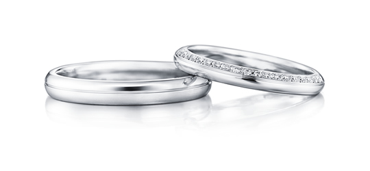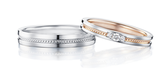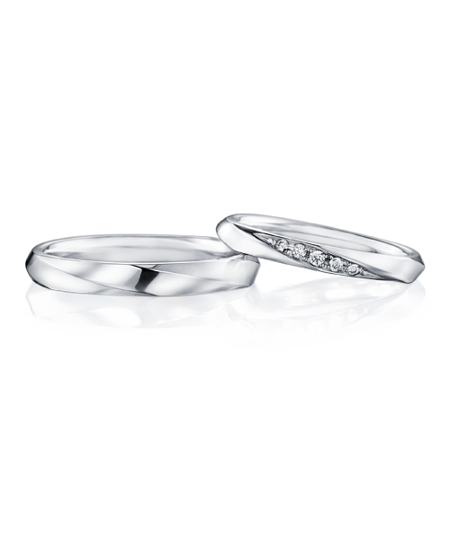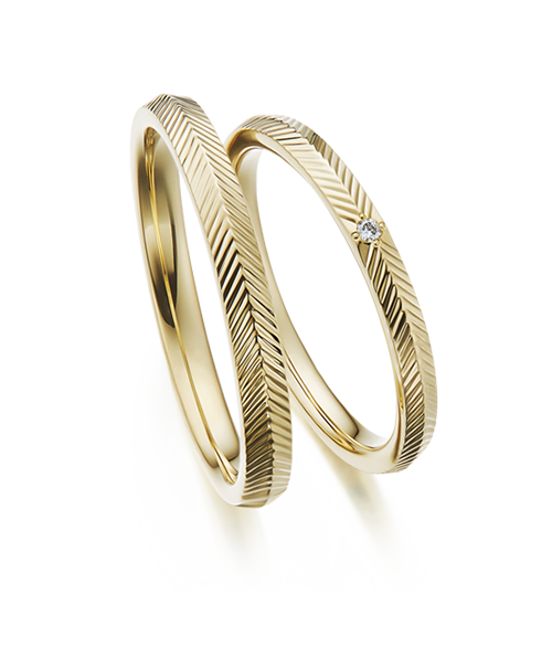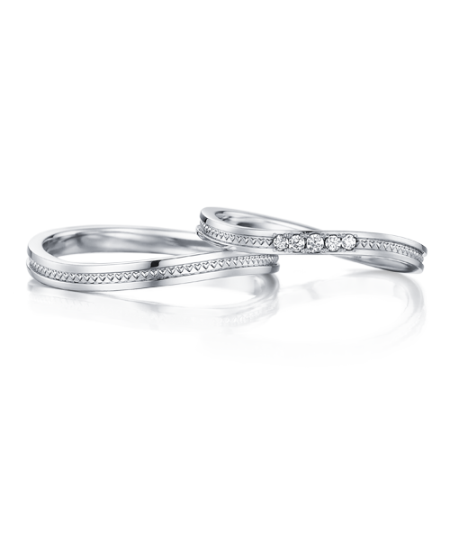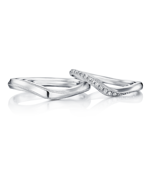 おふたりがやさしく手を握りあうような、ゆるやかなウェーブのデザインです。流れにそってセッティングされたメレダイヤは、レディースに華やかさを添えています。結婚の女神の名前を持ち、おふたりをずっと見守ります。