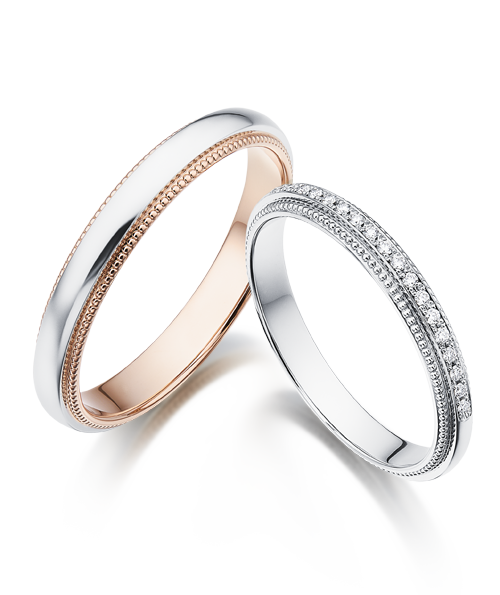 創造の天使の名に由来するマリッジリングです。柔らかな甲丸のフォルムに沿うように一周するラインは、永遠の愛を表し、レディースに敷き詰められたメレダイヤの天使の輪は、おふたりの幸福を象徴しています。