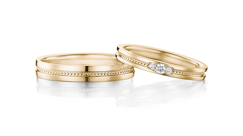 シンプルなミルグレインのリングに見えて、ハートが途切れることなく続いていく。クールな中にもロマンティックさを秘めたマリッジリングです。天空の女神が花嫁に授ける冠をイメージした高貴で華やかなデザイン。3つのダイヤモンドがキャンディのようなフォルムで並んで、ピュアな輝きを放ちます。なめらかな着け心地と安心感のある丈夫さは、鍛造リングならでは。永遠の愛を約束するおふたりの一生のお守りになりますように。