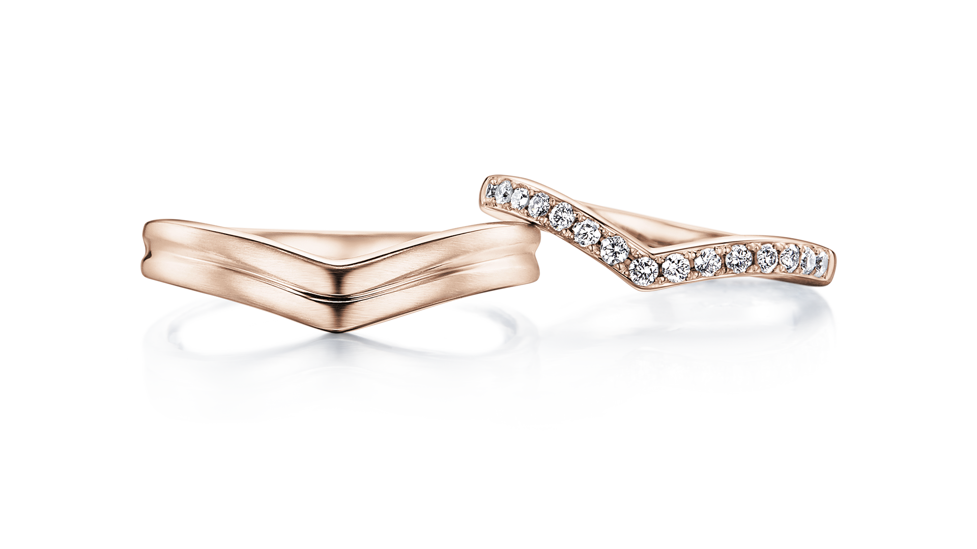 エジプト神話の女神からインスパイアされた、ハートのようなやさしいV字ラインのマリッジリングです。メレダイヤモンドを隙間なく埋め込んだハーフエタニティリングは、華やかでありながらも華奢な印象で、エンゲージリングと重ねやすいのも嬉しいポイント。同じV字にヘアライン加工を施したリングは、つや消しの中に光沢のラインが光る粋なデザイン。シンプルな中にこだわりが散りばめられた、さりげないおそろい感に心躍るリングです。