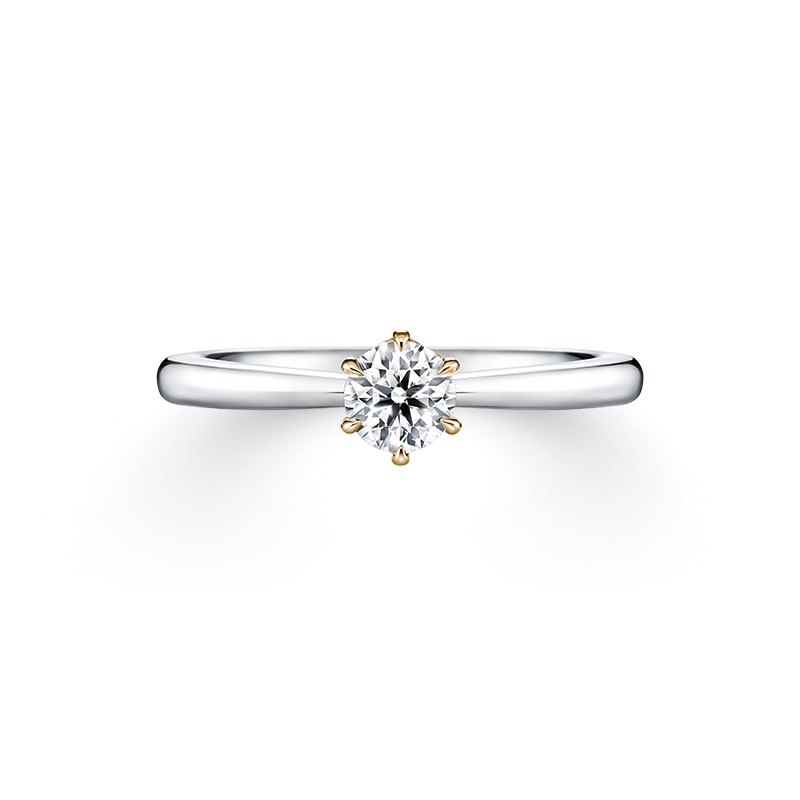 さそり座のハートの部分にあたる一等星をモチーフにした、ゴールドとプラチナのコンビネーションが印象的なソリテールリングです。王冠のような石座にのみイエローゴールドを使用したひねりの効いたデザイン。ハートの透かしと4石のメレダイヤモンドがセンターダイヤモンドを支えながら、より一層きらびやかに輝かせます。シンプルな第一印象から、華やかなサイドビューにときめく、一途な想いを表現したエンゲージリングです。
