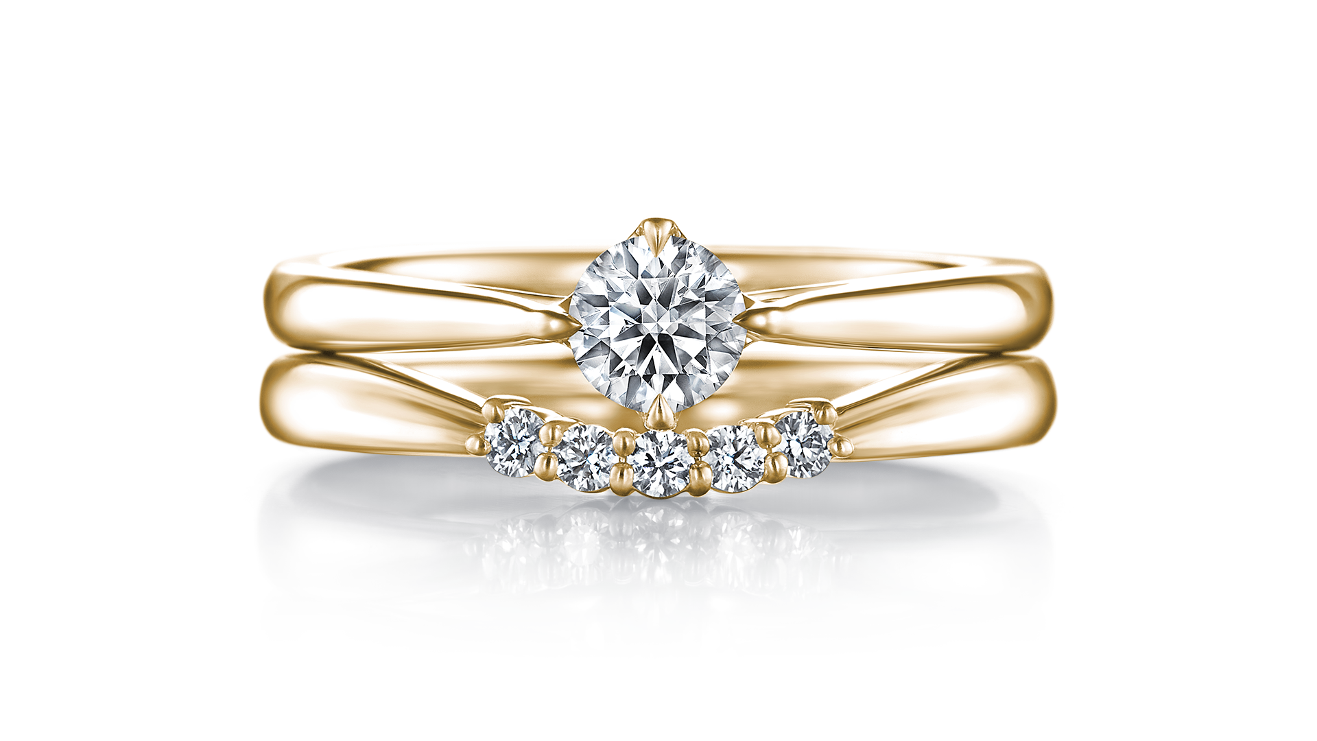 さそり座の一等星のような、ダイヤモンドそのものの美しさを最大限に引き出したエンゲージリングに、女神の天秤をモチーフにした曲線が愛らしいマリッジリングを組み合わせたファッショナブルなコーディネートです。センターダイヤモンドに寄り添うように、5石のメレダイヤモンドが並んで華やかさをプラス。凛とした決意に、ほっとするやさしさがほのかに漂う、ダイヤモンドの持つ多彩な魅力を存分に味わえるセットリングです。