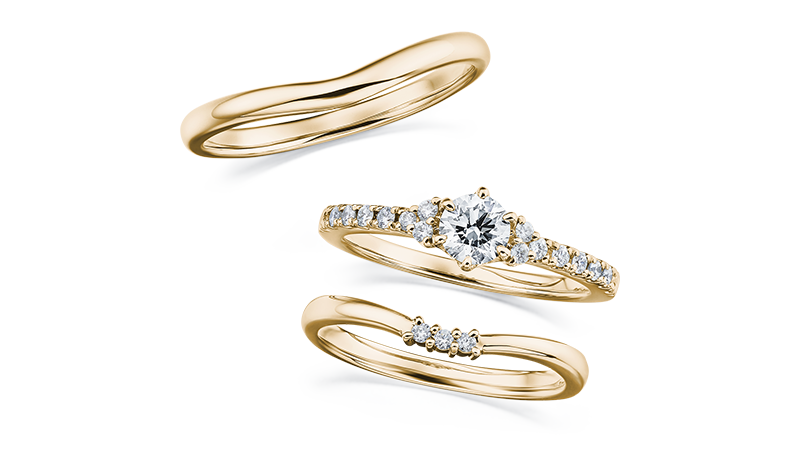 幸せを射止める矢をイメージした「アスセラ」と、結婚を祝福する谷間の妖精「ナパイア」を合わせたコーディネートです。ストレートと V字という異なるフォルムでありながらも、重ねてみると驚くほどフィット。エンゲージリングのセンターダイヤモンドが、マリッジリングのゆるやかなカーブにちょうどよく収まり、やさしい一体感が生まれます。キラキラと光沢の質感のコントラストもバランスがよく、いろいろな表情を楽しめます。