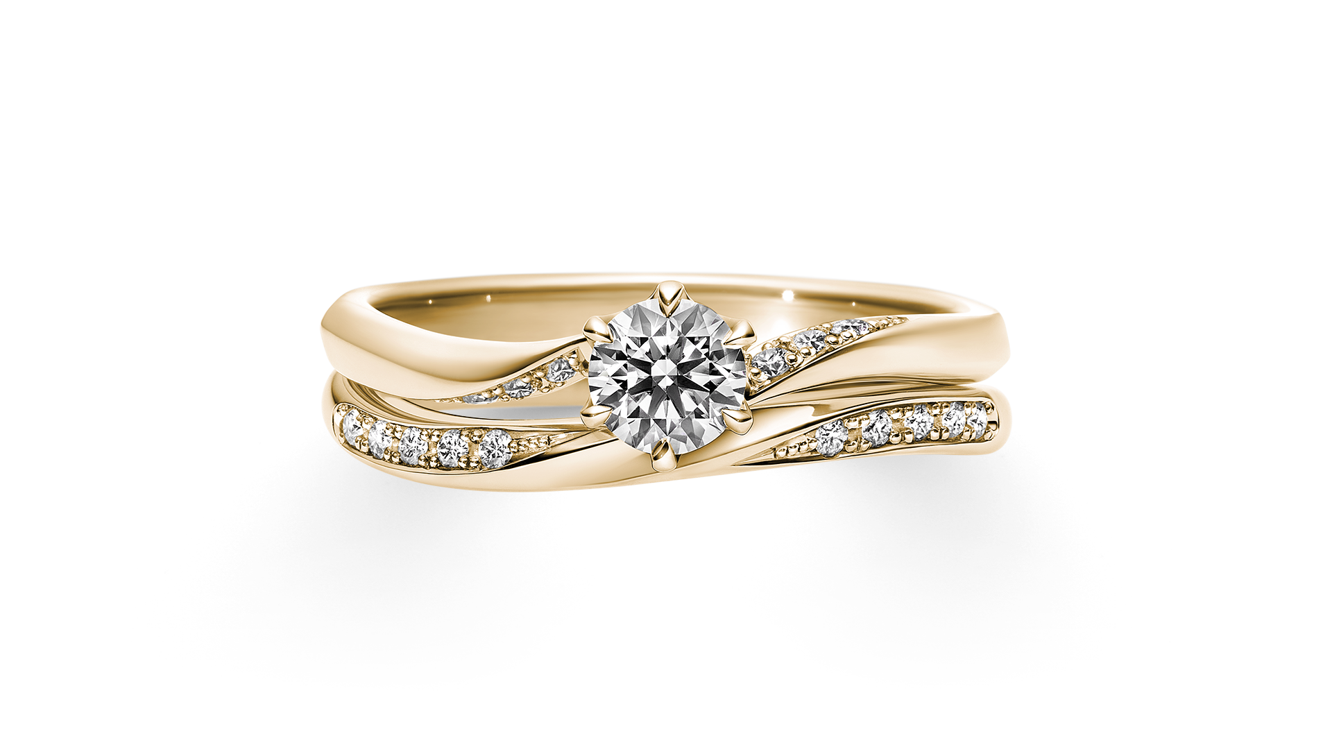 ブライダルブーケの花として人気のフランネルフラワーをモチーフにしたエンゲージリング「フラネリー」と、ウェーブラインが美しいマリッジリング「ペルセウス」は、ラインが寄り添います。どちらも細身なので、重ねても女性らしい柔らかな印象はそのまま。角度のついたメレダイヤモンドが全方位に輝きを放ち、目に入るたびに幸せな気持ちになれます。運命の出会いにふさわしい、祝福に満ちたセットリングです。