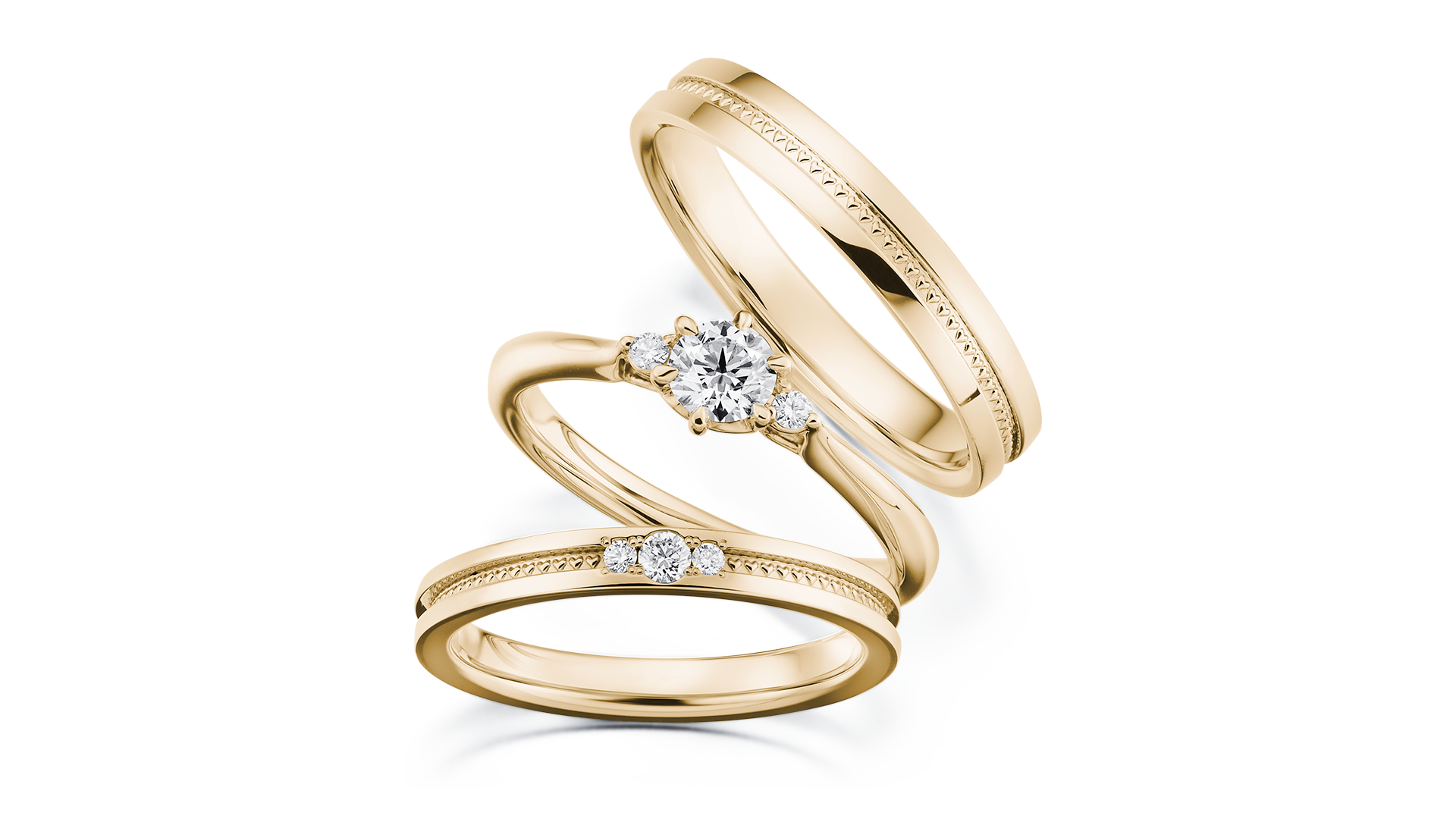 センターダイヤモンドを支えるハートの透かし、一周続くハート型のミルグレイン。たくさんのハートが散りばめられた、愛あふれるセットリングです。ストレートライン、3石のダイヤモンドという共通点のある2つのリングを重ねると、プリンセスのティアラのようなデザインが完成。華やかですが、飛び出しが少なく低めのセッティングなので、気兼ねなく日常使いができます。ときめきと安心感、両方を叶えてくれるセットリングです。