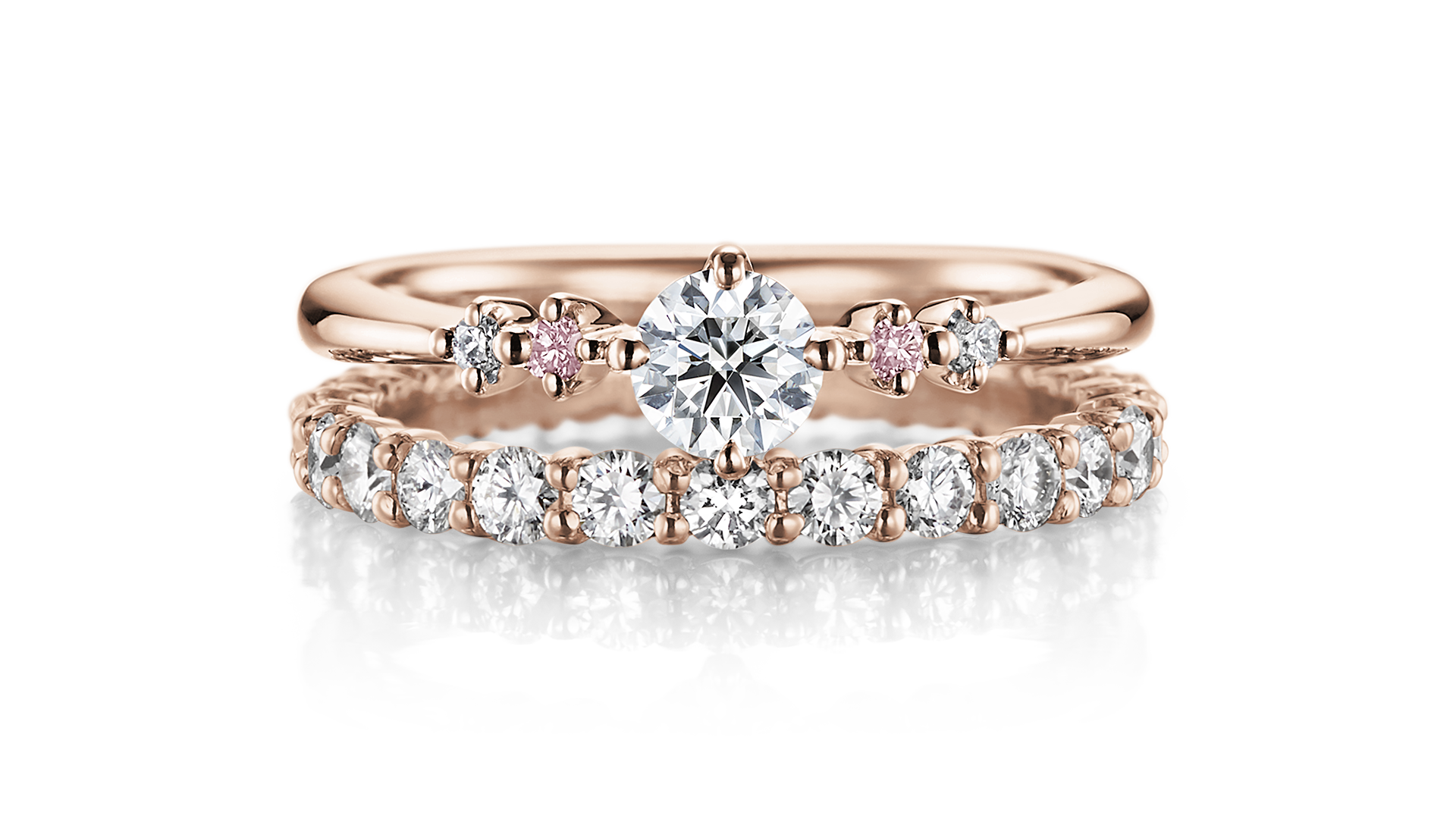 ピンクと白の色違いのメレダイヤが輝く、愛らしいエンゲージリング「トゥインクル」に、ピンクゴールドのエタニティリング「マーニ」を組み合わせた、華やかなコーディネート。