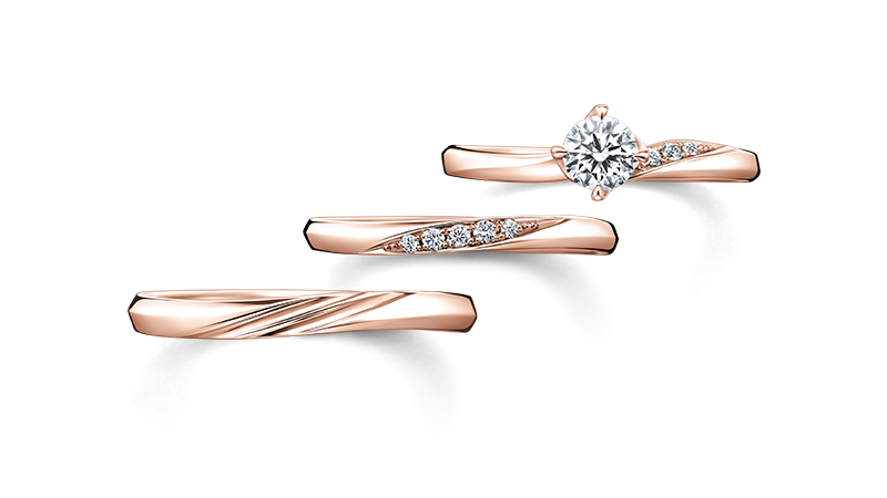3本のリングが揃うとき、幸せの青い蝶が羽ばたく。デザインから着け心地に至るまで一体感を追求したセットリングです。メレダイヤモンドのラインと陰影のあるエッジラインが流れるようにシンクロする計算されたデザイン。重ねても繊細な魅力を持ったまま、ぴったりフィットして驚くほど軽やか。安らげる場所を見つけたおふたりの幸福感と、居場所があるからこそ羽ばたいていける心強さを、どんな時も思い出させてくれます。