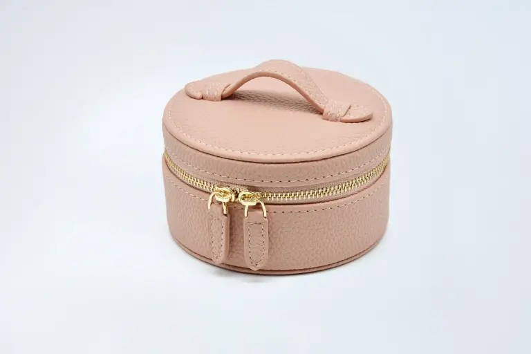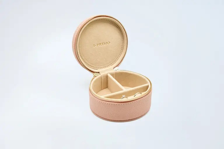 持ち運びもできるサイズ感のラウンドジュエリーケースです。