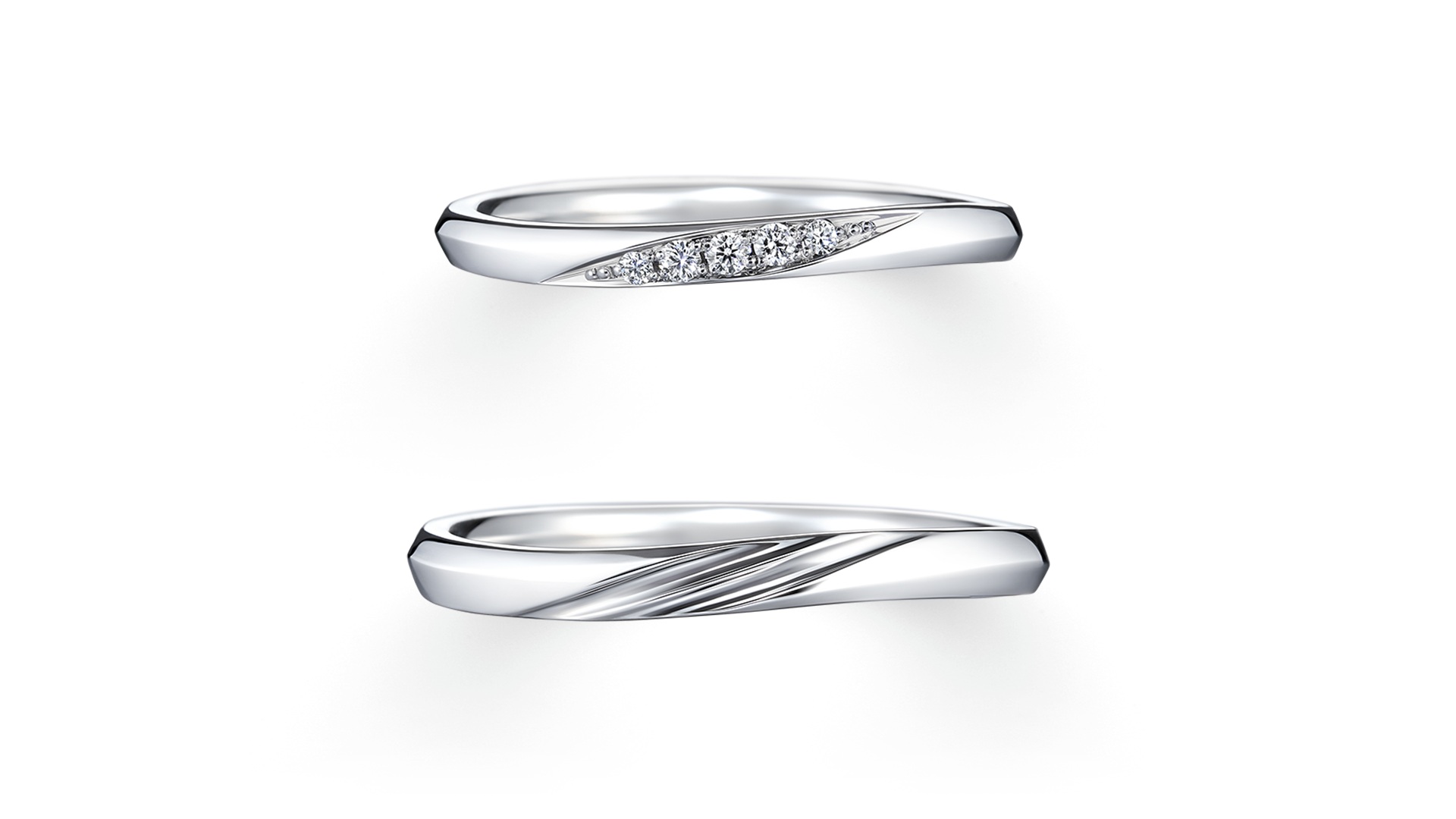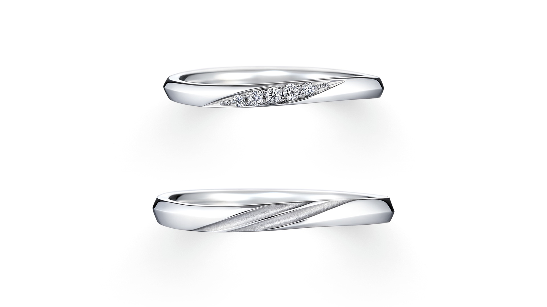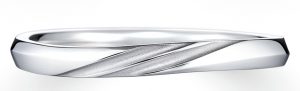 斜めのくぼみのラインが入り光が当たると陰影を楽しむことができクールな印象で着けていただけます。