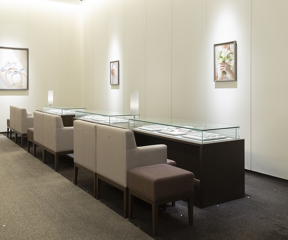 商業施設ららぽーと湘南平塚の2階にあり、天井の高い空間でゆったりとくつろぎながら、指輪選びをお楽しみ頂ける店舗です。
