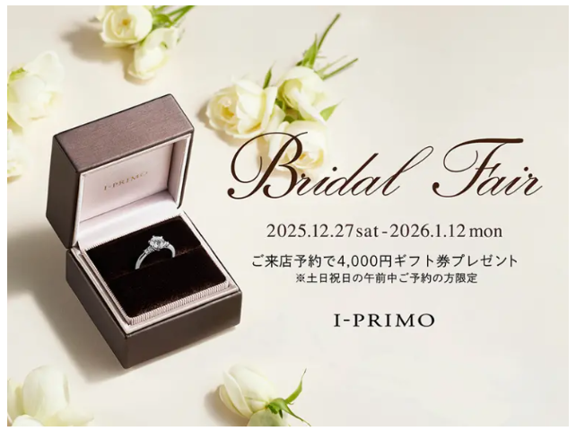 アイプリモでは2025年12月27日(土)~2026年1月12日(月)の期間中、Bridal Fairを開催しております。