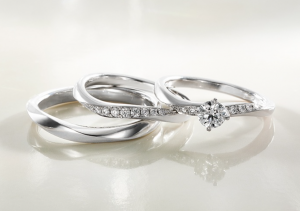 婚約指輪1本でも美しいですが、結婚指輪と重ねると一体感がありさらに美しい輝きを楽しむことができます。