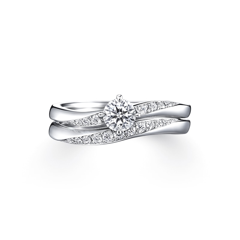 隙間からこぼれるヌーディな透明感。ひねりのあるウェーブラインに沿って敷き詰められたメレダイヤモンドが、全方向に輝きを放ちながら指をすらりと長く見せます。