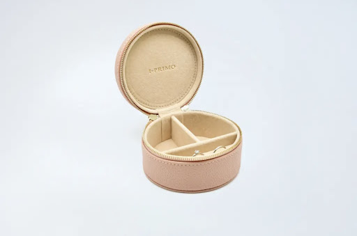 アイプリモオリジナルのレザー調のラウンドジュエリーケース。
