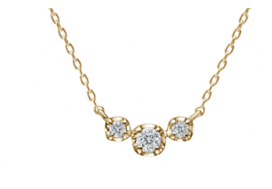 「過去・現在・未来」を象徴するスリーストーンネックレスにちなみ、『3つの星』という言葉からネーミングされています。デコルテで浮いたように輝くV字型のデザインが、首元をすっきりと彩りながら、可憐で愛らしい印象を与えます。