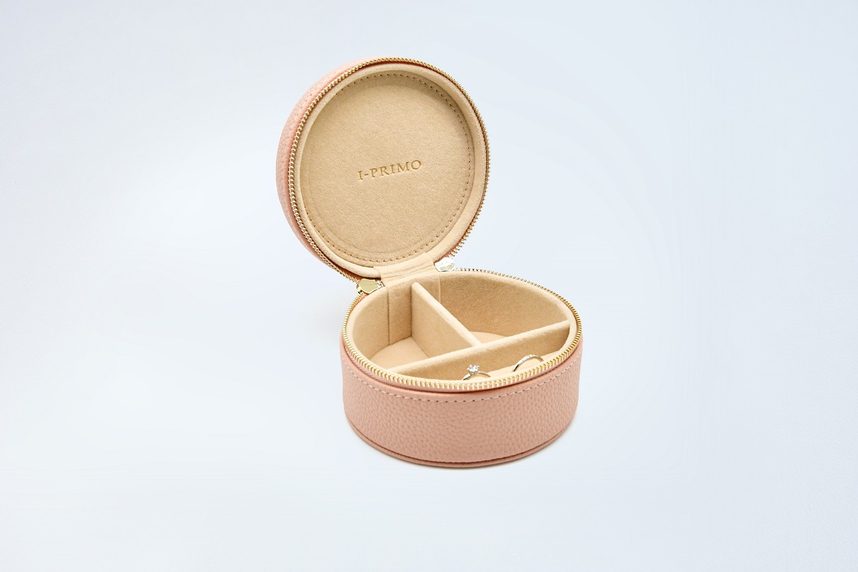 アイプリモオリジナルのレザー調のラウンドジュエリーケース。ご自宅や旅行先でジュエリーを大切に保管いただけます。